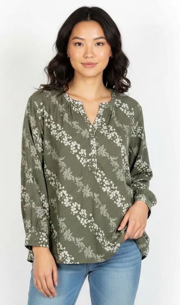 Wonderly plus size tunic top in olive green featuring a delicate white floral print. This long sleeve top has a flattering V-neckline with a slight button placket and a relaxed fit. It's perfect for casual outings or a comfortable day at home. Type: Blouse Department: Women Style: Tunic Material: Polyester Neckline: V-Neck Sleeve Length: Long Sleeve Sleeve Type: Casual Sleeve Pattern: Floral Theme: Peasant Features: Collarless Fit: Relaxed Fabric Type: Woven Occasion: Casual Closure: Pullover Season: Spring, Fall Garment Care: Machine Washable Keywords: plus size, tunic, olive green, floral, v neck, long sleeve, casual, comfortable, relaxed fit, womenswear, fall fashion, spring fashion Approx. Measurements: Pit to pit: 25" Sleeve length: 22" Length: 28.5"