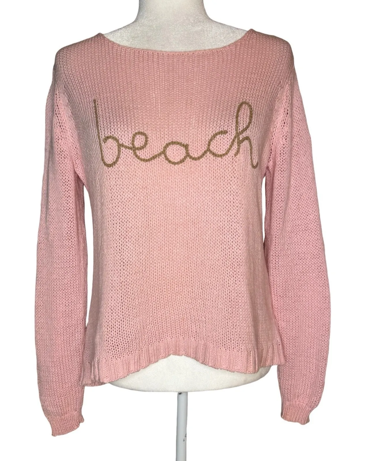 Wooden Ships women's knit sweater in a soft blush pink featuring the word "beach" stitched across the chest in a tonal rope-style script. This lightweight sweater is crafted in an airy open-knit design with a relaxed silhouette, bateau neckline, long sleeves, and ribbed hem and cuffs for an easy, casual fit. Designed by Paola Buendia, this piece embodies Wooden Ships' signature preppy coastal aesthetic and is perfect for beach days, vacations, or laid-back layering. The cotton blend knit is breathable and comfortable, making it ideal for spring, summer evenings, or resort wear. Women's size XS/S. Please refer to measurements in photos for best fit. Condition Excellent pre-owned condition Ships within 24 hours Keywords wooden ships sweater beach sweater pink knit sweater preppy coastal resort sweater vacation beachy pullover xs small open knit lightweight sweater paola buendia wooden ships knit coastal casual summer sweater relaxed fit beachwear layering piece