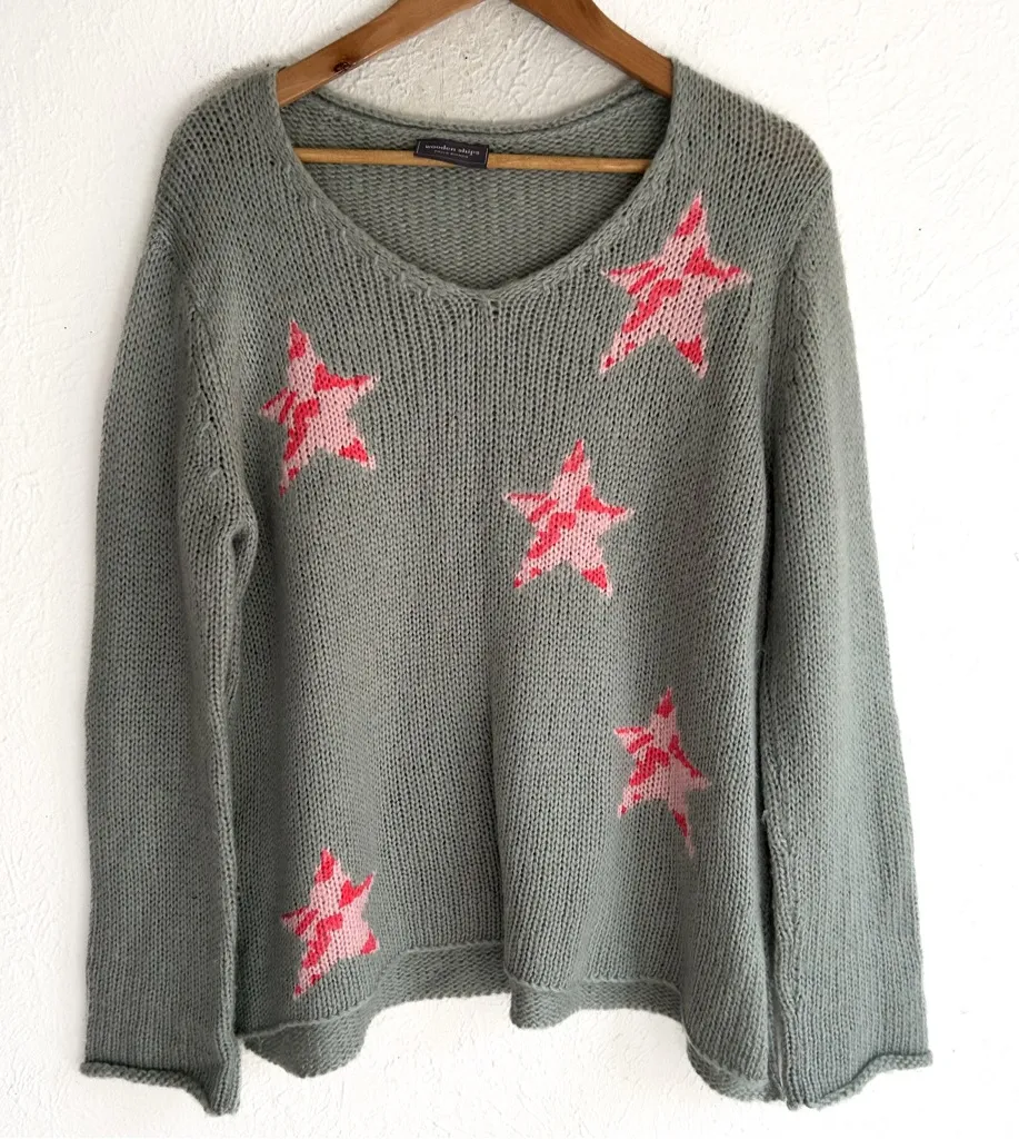 Wooden Ships sweater features a soft open-weave knit with pink star motifs across the front. The gray base gives it that relaxed, coastal-casual vibe that Wooden Ships is known for. The slightly slouchy fit, soft mohair blend, and breathable texture make it great for layering. 76% acrylic, 12% mohair, 12% wool Excellent preowned condition ▫️Armpit to armpit-23” ▫️Length-27” Measurements are approximate coastal casual, cottagecore light, comfy chic, soft girl, weekend style, star print sweater, cabin cozy, ski lodge vibes, apres ski