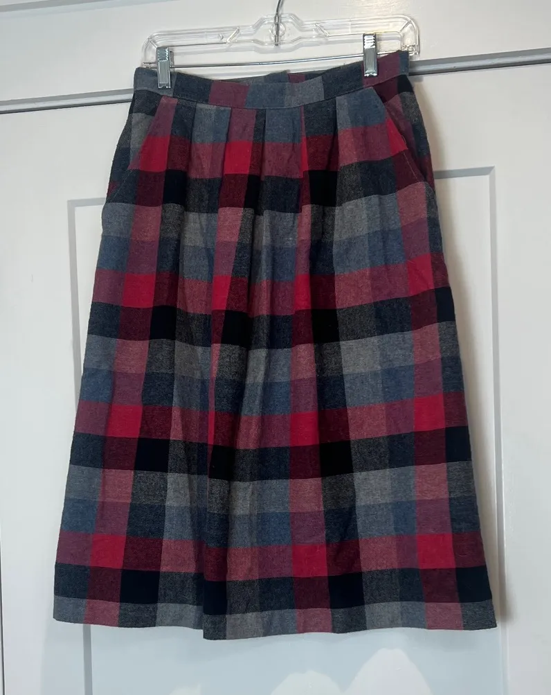 Vintage Stylish plaid A-line skirt featuring a classic red, black, and grey pattern. Perfect for any occasion. Does have pockets and zips in the back. In great condition! This is vintage, so please check measurements before purchasing as vintage sizes do run smaller. Perfect for the fall and holidays! Measurements lying flat: Waist: 14 inches Length of skirt: 28 inches