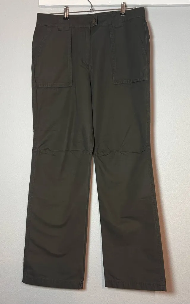 100% Cotton Flap back pockets I believe they are a straight leg style High waisted Small discoloration as pictured Green undertone to pants 1063 Waist: 33” Rise: 12.5” Inseam: 30.5” Leg Opening: 9.5”
