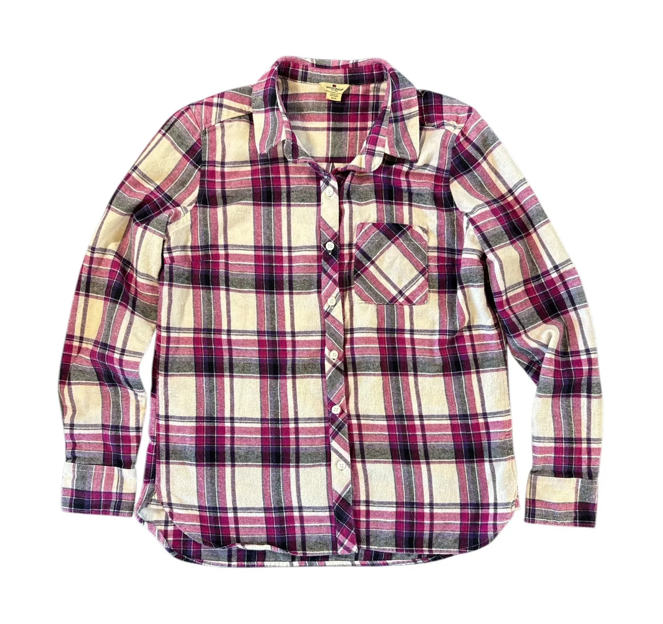 WOOLRICH women's long sleeve flannel shirt in a classic plaid pattern. Features a button-up front, single chest pocket, and a comfortable relaxed fit. Perfect for casual wear, layering on cooler days, or outdoor adventures. Approximate Measurements: • Chest: 19 in • Length: 26 in Type: Button-Up Department: Women Style: Basic Material: 100% Cotton Neckline: Collared Sleeve Length: Long Sleeve Sleeve Type: Classic/Fitted Sleeve Pattern: Plaid Accents: Button Features: Pockets Fit: Regular Fabric Type: Flannel Occasion: Casual Closure: Button Season: Fall, Spring, Winter Keywords: woolrich, flannel, plaid, shirt, womens, long sleeve, button up, casual, outdoor, layering, cozy, autumn, fall fashion