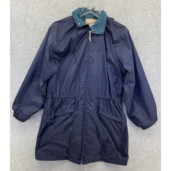 Woolrich Women's Raincoat Blue Hoodie Size Small Nylon Jacket Cinch Waist long - $41 - From Plush