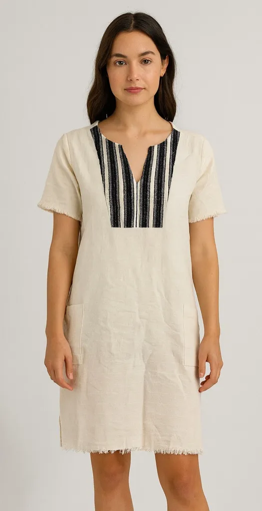 Bohemian-inspired dress with a relaxed and stylish design. This cream-colored dress features a unique black and white striped woven design around the V-neckline, adding a touch of artisanal flair. The short sleeves and hemline are finished with a subtle fringe trim, enhancing its casual and breezy feel. It also includes practical front pockets, blending functionality with fashion. Perfect for a summer day out, a casual brunch, or a relaxed vacation getaway. Style: T-Shirt Dress, Shift Dress Length: Knee Length Color: Beige Department: Women Sleeve Length: Short Sleeve Pattern: Striped Occasion: Casual, Travel Material: 100% Cotton Neckline: V-Neck Fabric Type: Woven Character: Bohemian, Beach, Festival, Casual, Summer Season: Summer, Spring Sleeve Type: Cap Sleeve