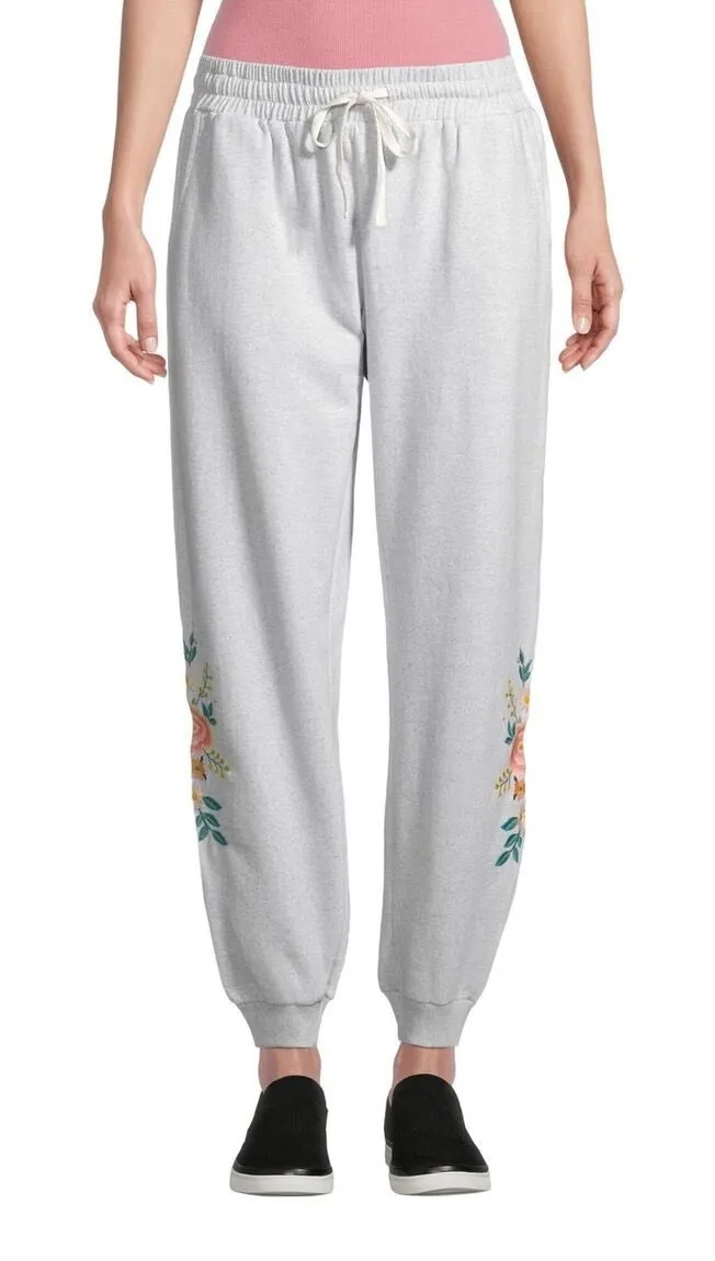 Cozy and stylish sweatpants featuring a relaxed fit and delicate floral embroidery. These light gray joggers offer both comfort and a touch of elegance with their drawstring waist and elastic cuffs. The floral details add a feminine touch, making them a versatile addition to your wardrobe. Perfect for lounging at home, running errands, or casual outings with friends. Measurements: * Across: 15 inches * Length: 28 inches Style: Sweatpants Color: Gray Department: Women Type: Pants Material: Cotton Blend, Cotton Leg Style: Tapered Features: Drawstring Waist, Elastic Waist, Elastic Cuffs, Comfort, Pockets Fabric Type: Fleece Closure: Drawstring Pattern: Floral Accents: Embroidered Occasion: Casual Keywords: World Market, sweatpants, joggers, floral embroidery, lounge pants, casual pants, comfortable, drawstring waist, elastic cuffs, gray sweatpants, S/M, womens pants, embroidered pants, cozy, relaxed fit
