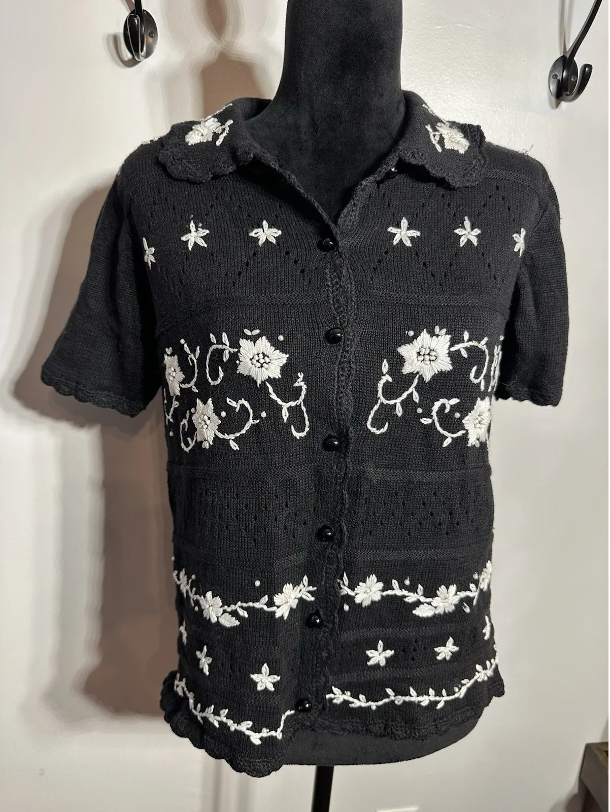 The Vintage Short Sleeve Sweater Cardigan in black with white floral knit and pearls adds a touch of... Show more