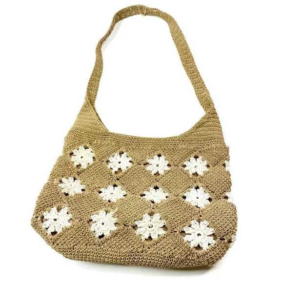 Woven Tan Crochet Floral Olefin Cotton Summer Shoulder Bag Purse - $25 - From Emily