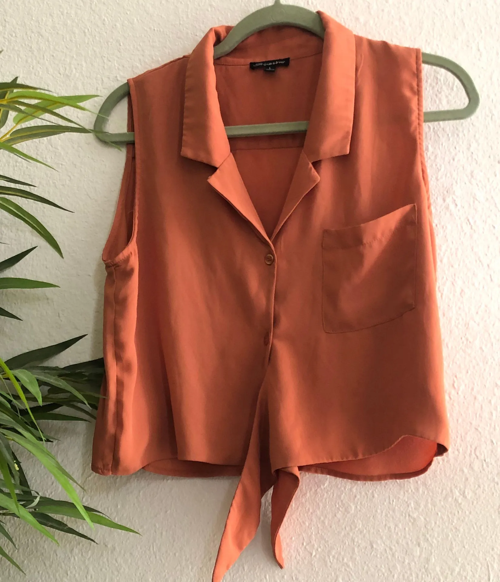 Orange button up down sleeveless tie uo crop top blouse shirt