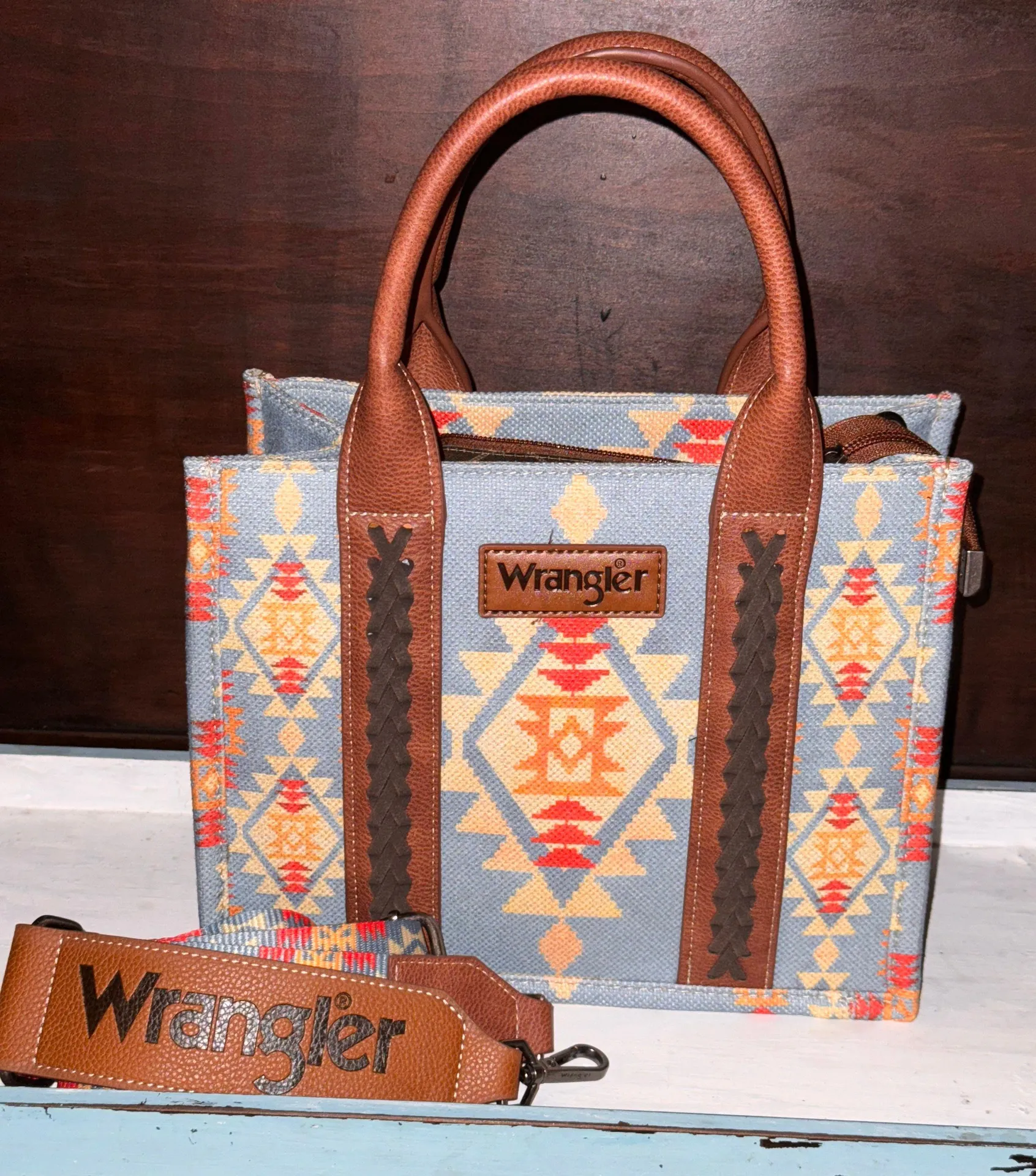 Wrangler Aztec Crossbody/ Shoulder Tote-bag Allover Aztec print dual sided canvas with Whipstitch d... Show more
