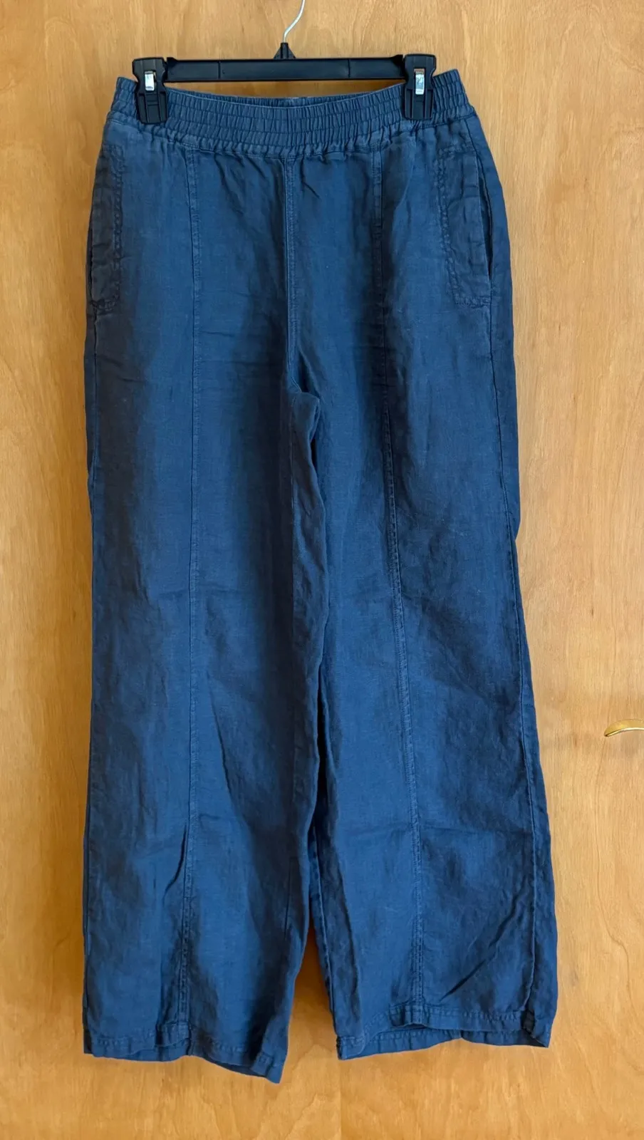 Effortless sophistication meets laid-back comfort in these chic linen trousers. A cool, slate blue hue brings a refined touch to the breezy, cropped silhouette, creating a look that's both stylish and easy to wear. The wide-leg design ensures a flattering fit and unrestricted movement, while the elasticated waistband provides all-day comfort. Functional pockets add a practical element to these fashionable bottoms, making them ideal for everyday wear. Imagine pairing these pants with a simple white tee and sandals for a relaxed weekend brunch or dressing them up with a silky blouse and heels for a summer evening gathering. Measurements: • Inseam: 28.5" • Waist: 14" Features: Pockets, Elastic Waist, Comfort, Lightweight Keywords: Wrap London, Linen pants, Wide leg pants, Cropped pants, Elastic waist pants, Casual pants, Blue pants, Womens pants, Summer pants, Comfortable pants, Boho pants, Relaxed fit pants,