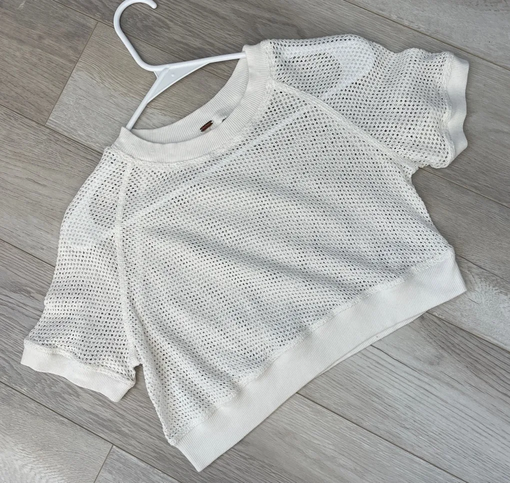 Free People Mesh Crop Top in the color White. Crew neckline, short sleeve, crop length. Open, loose... Show more