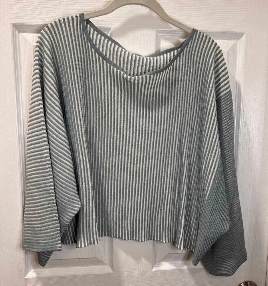 Elegant Wynne Layers striped ribbed knit top in gray and white. Features a V-neck and long sleeves with a relaxed fit. Perfect for casual outings or layering. Made of soft 89% viscose and 11% nylon blend for comfort. Ideal for office wear, weekend brunches, or evening gatherings. Easy care with hand wash instructions. Color: Gray/ice blue Type: Blouse Department: Women Style: Tunic Material: Viscose, Nylon Neckline: V-Neck Sleeve Length: Long Sleeve Sleeve Type: Dolman Sleeve Pattern: Striped Accents: Ribbed Features: Lightweight, Relaxed Fit Fit: Relaxed Keywords: Women's top, Long sleeve, V-neck, Casual, Blouse, Striped, Ribbed, Knit, Gray, White, Viscose, Nylon, Wynne Layers, Large