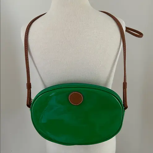 Fun bright green patent leather Liz Claiborne crossbody bag with brown leather strap. Top zipper ope... Show more