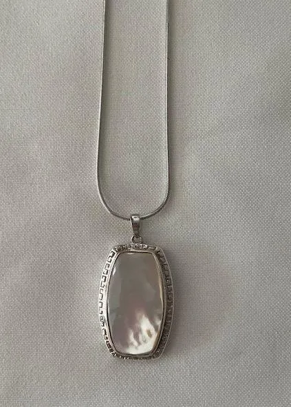 Vintage Sterling Silver Mother of Pearl Pendant Necklace has squared oval pendant with a white Mothe... Show more