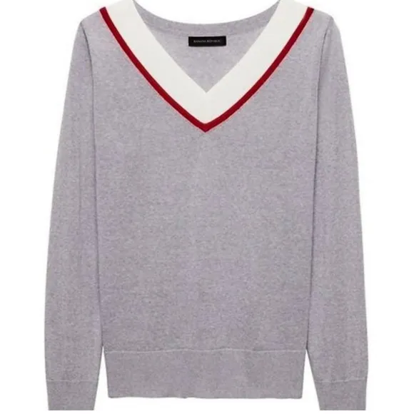 Varsity style merino wool sweater. Lightweight. Grey with red piping along the cream collar detail.... Show more