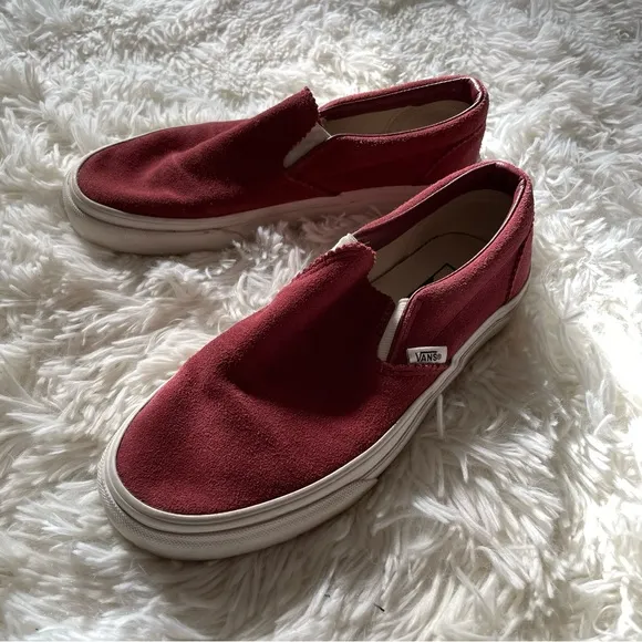-5 Men / 6.5 Women -Red-burgundy suede slip on sneakers with scalloped trim -Excellent condition
