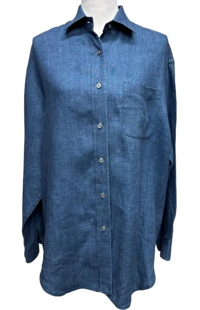 Stay cool and fashionable in this top from Lauren Ralph Lauren. This top features: Linen fabrication Point collared neckline Button front closure Long sleeves Button barrel cuffs with pleating detail Shirttail hem Relaxed fit Approx. 29" length Linen Dry clean See photos for approximate measurements. Reasonable offers are accepted. From a smoke free, pet friendly home.