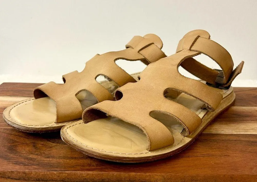 Kork-Ease Gaby Gladiator Sandal in tan. This is a genuine leather sandal in gladiator style. Adjustable ankle straps with silvertone logo branded buckle. Padded footbed. Leather lining and sole. Size 6. Sandals are in great pre-owned condition with some signs of wear on the soles. Leather has been conditioned. They have a few minor scuffs. Please see all photos for full details!