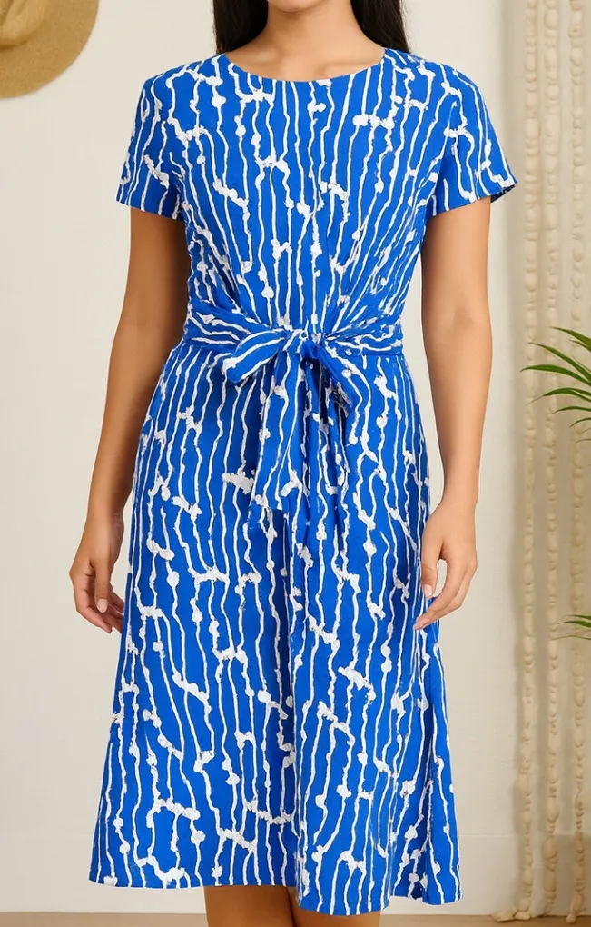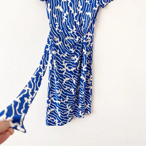 size 0. Chic and timeless, this DVF Zoe Faux Wrap Dress features a blue and white abstract print, bo... Show more