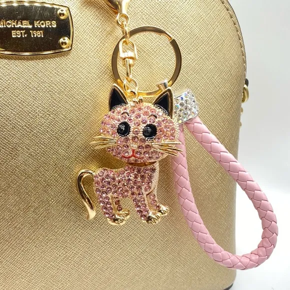 🐈🩷Pretty Pink Crystal Rhinestone Kitty Cat With Moveable Body Keychain Bag Charm Key Ring With Gold-Tone Hardware and Braided Pink PU Key Ring This adorable bag charm is super pretty & fun! Makes a charming gift for yourself or someone special. 🌸✨ Included: 🐈 Velvet pouch for storage and gift giving 🌸 Search my closet for other cute accessory listings🌸 Gift, Keychain, Key Ring, Bag Charm, Phone Accessory, Backpack Charm Accessory, Glittery, Sparkly, Bling, Blingy, Luxe, Luxury, Fancy, Bougie, Fun, Pretty, Beautiful, Rhinestones, Fancy