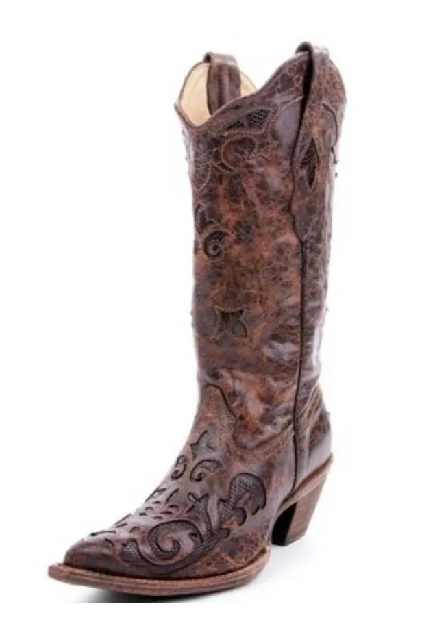 Corral Women's Chocolate Lizard Inlay Snip Toe Cowgirl Boots Sole material: Rubber Outer material: Leather Closure type: Slip-on About this item Handcrafted Genuine leather Color: Chocolate Pointed toe Style C2109 Shaft measures approximately 12" from arch Heel measures approximately 2 inches Aged leather dressed with exotic lizard inlay and laser cut floral detail Tinting, abrasions, and scarring on leather add vintage boot character Handcrafted leather upper, lining, heel, and soleu Description The Corral Boot Company was built on unwavering values that continue to hold Corral boots in the highest regards for fashion western boots. Only the most experienced boot makers craft Corral boots by hand, and only from the finest leathers. Each Corral boot is handcrafted, one at a time, ensuring a western boot that is unique in design and incomparable in quality.