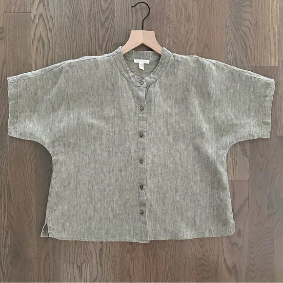 Eileen Fisher linen short sleeve button front top. In pale olive green. 100% organic linen. Crew nec... Show more