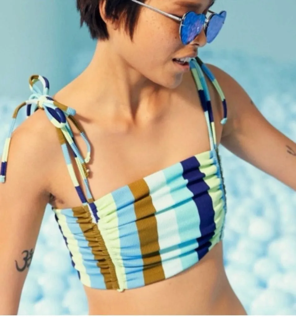 Aerie Size M Long Line Bandeau Bikini Top Striped Ribbed Ruched Tie Straps NEW