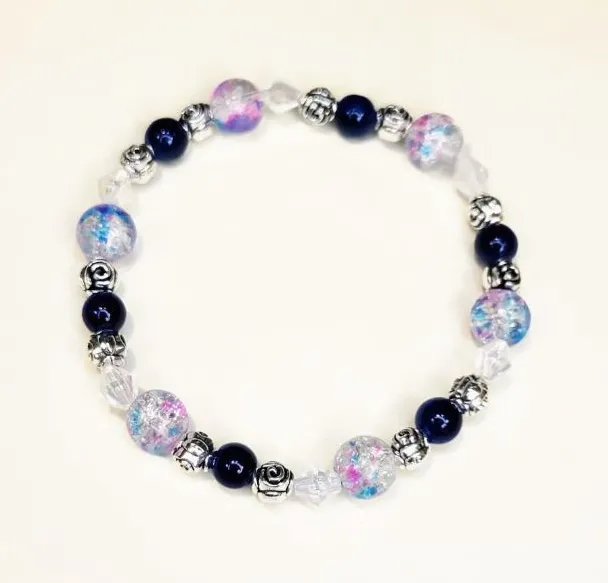 Handmade pink and blue glass 8mm cotton candy crackle beads, with 4mm iridescent faceted beads, and metal rose end beads on each side of a navy 6mm glass bead. Fits a wrist up to 6.5" best.