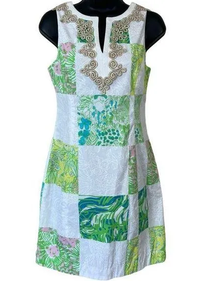 Lilly Pulitzer Janice Mini Dress Gold Lace Lioness Patchwork Has a blemish near the gold lace trim a... Show more