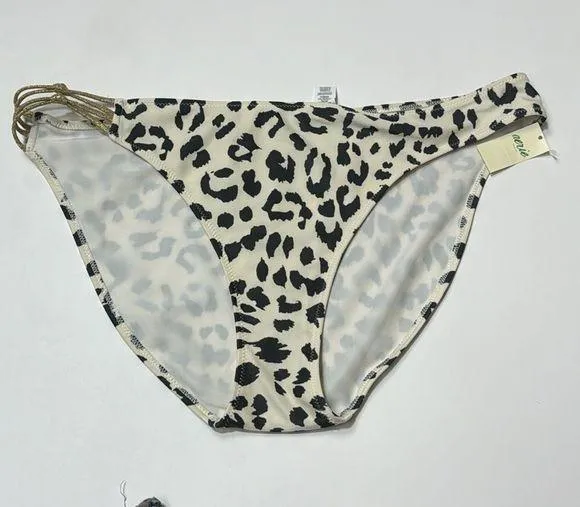 Chic animal print bikini bottom. Features bold black accents. Ideal for stylish swimwear.