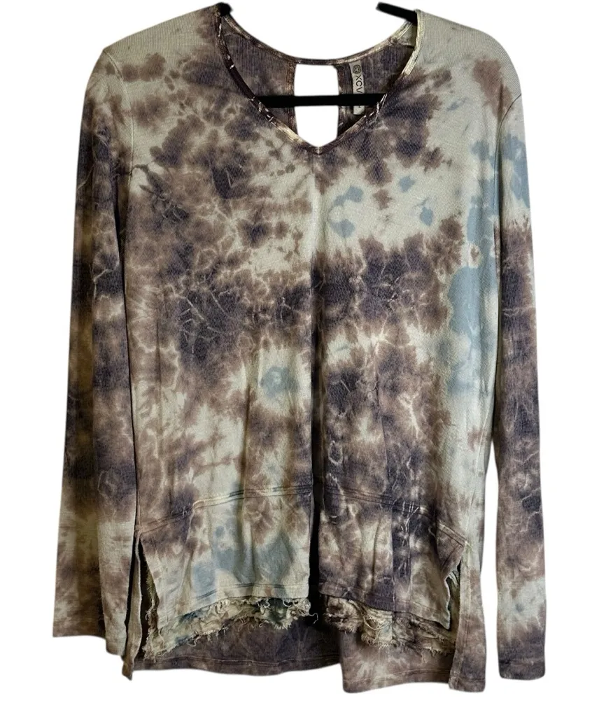 Embrace a bohemian vibe with this stylish tie-dye long sleeve top. Perfect for casual outings, it features a unique blend of purple and blue hues. Pair it with your favorite jeans for a relaxed look. Great condition see photos for details. Approximate measurements 27” shoulder to hem and 21” pit to pit unstretched. Modal polyester viscose rayon with base and contrast.