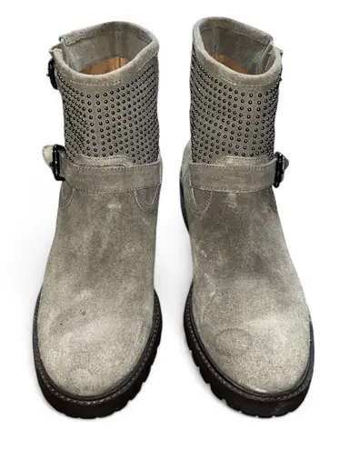 These Coach Studded buckle combat moto boots in supple taupe suede (tan / grey) feature a buckled ha... Show more