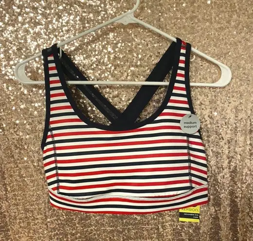 Super cute red, white, and navy sports bra! Medium support with fun mesh cross in back! New with tag... Show more
