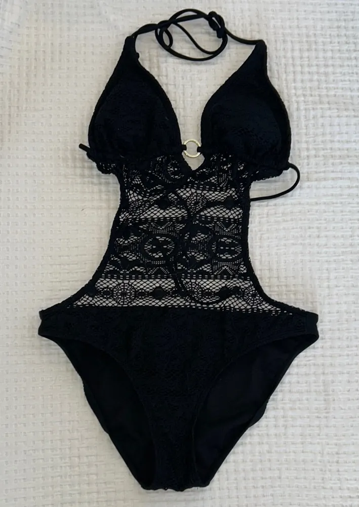 Elegant black one piece with lace detailing. Halter neck design. Perfect for beach or pool.