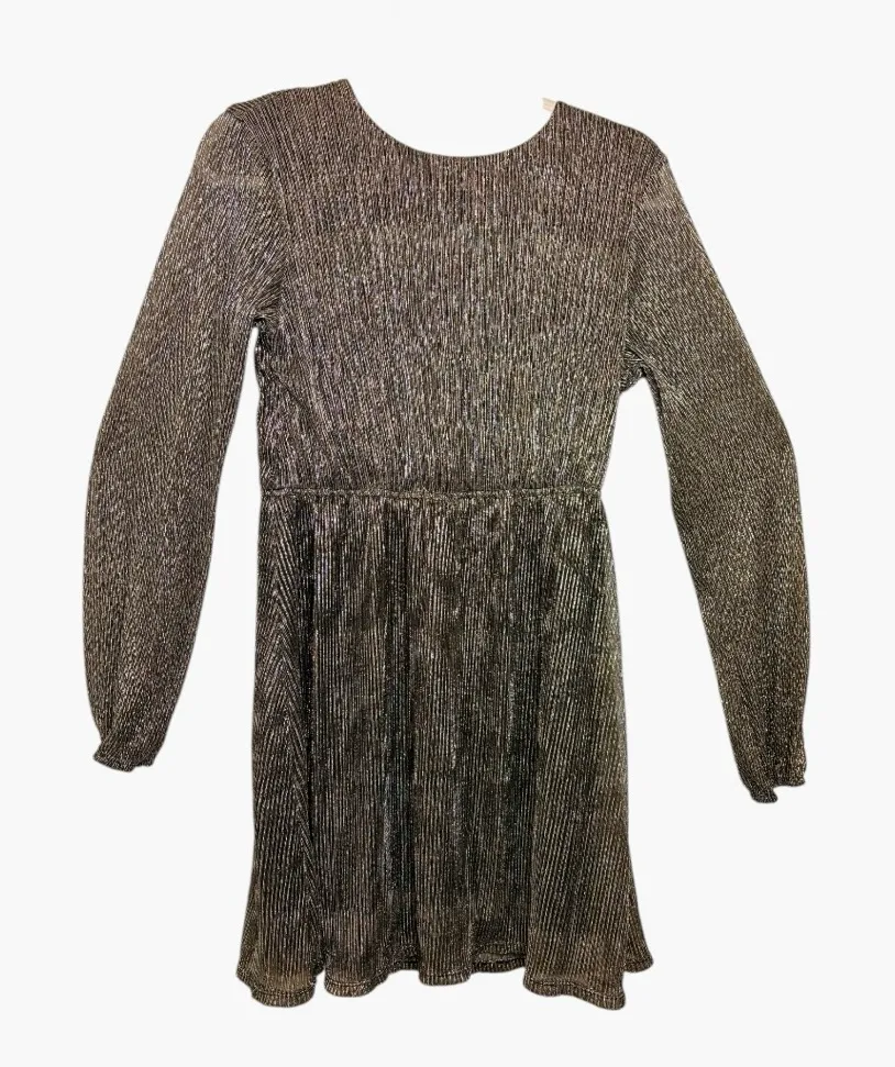 Gold metallic long-sleeve mini dress with an allover shimmer finish and a softly ruched waist that c... Show more