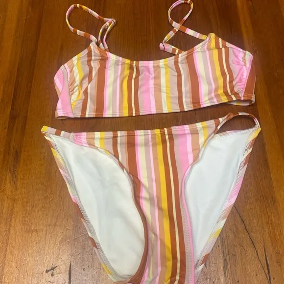 Embrace a retro vibe with this Xhilaration bikini, showcasing a delightful pink and brown striped pa... Show more