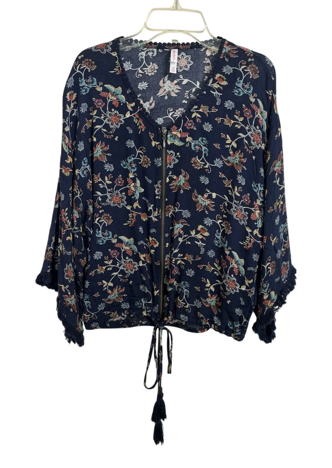 Fairy Xhiliration Women’s Size XS Navy Blue Floral Full Zip Top 3/4 Frange Sleeves Crochet Scal... Show more
