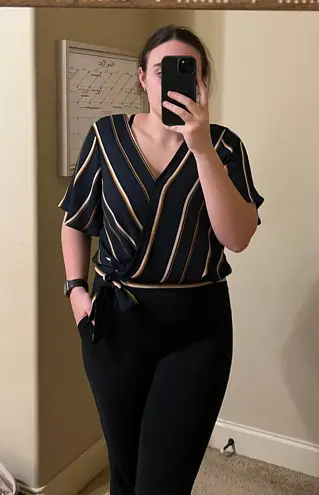dark green/navy striped wrap top, cinched in the back with side bow on the front, I wore it for more... Show more