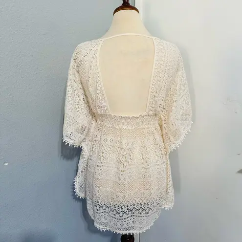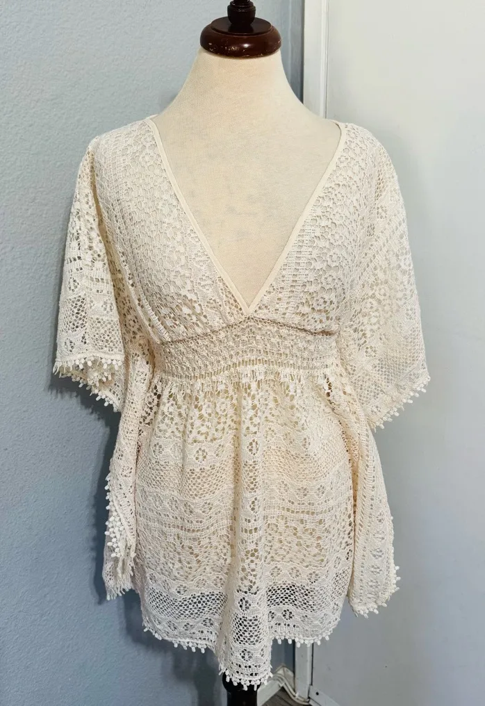 Chic cream lace top with intricate design. Ideal for stylish layering. Features: -See through -Smoke... Show more