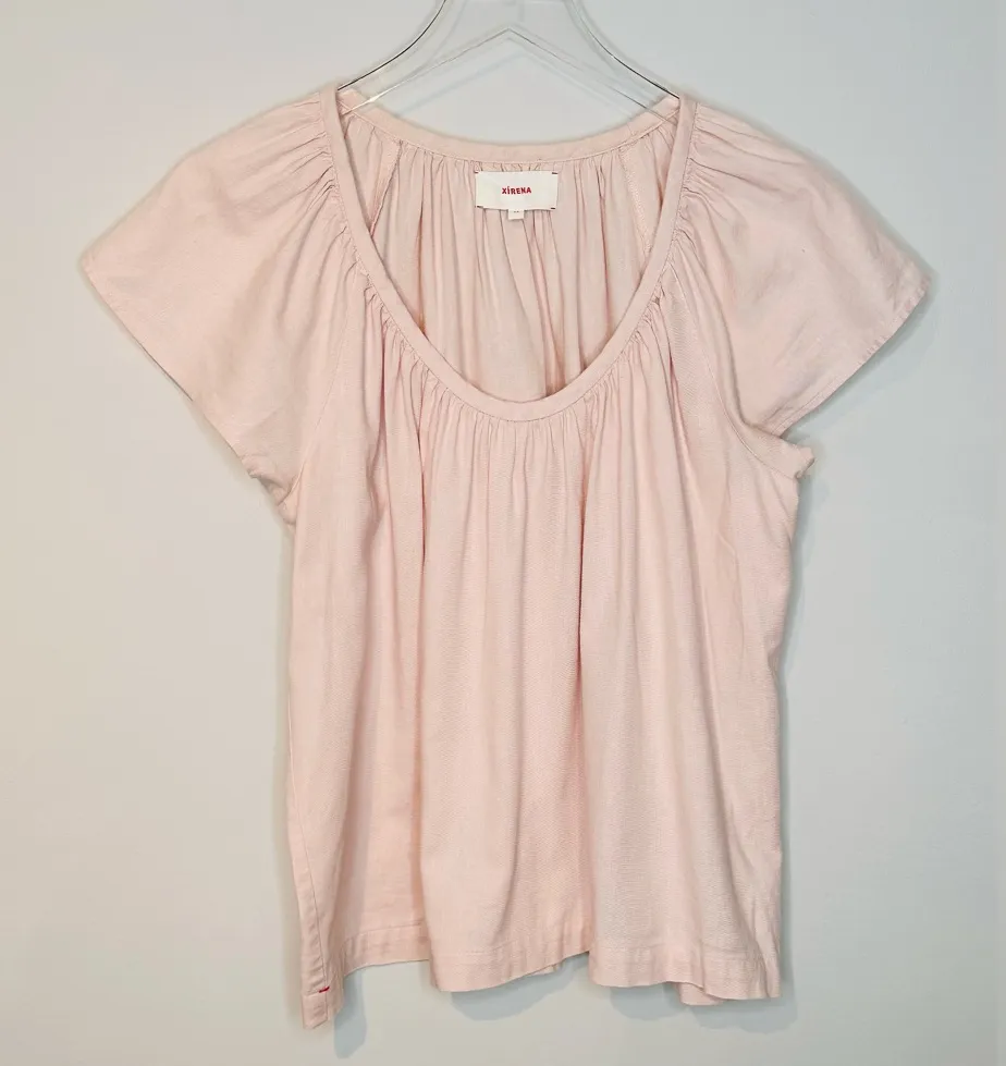 . A soft, light pink, pastel cotton flax blend top offers a relaxed feminine vibe. Gathered scoop neckline with raglan flutter sleeves. Fluid bodice with a straight hem. Signature red stitching at side seams. Pull on style. Unlined. Made in The United States. Fabric: 70% Cotton, 30% Flax. Care: Machine wash cold or dry clean. Condition: Preloved, gently used. Size: XS extra small. Measurements: Bust: 44”* Length: 22”* *All measurements are approximate and taken unstretched.