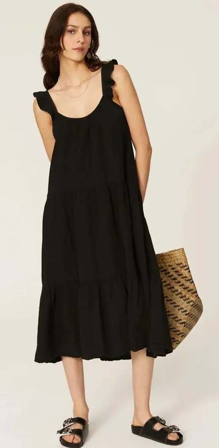 Xirena Rumer Scoop Neck Flutter Ruffle Sleeve Gauze Tiered Midi Dress Color: Black Size: XS Preowned, no flaws. Crafted in the label's signature Chelsea Gauze, this midi dress is a great example of XIRENA's knack for summery minimalism. We couldn't imagine a better silhouette for a casual seaside stroll, or a day spent exploring a local market. Tiered skirt. Flutter adjustable sleeves. Pockets. Pullover style, no closure. Unlined. Mid-weight, non-stretch double-gauze. 100% cotton. Armpit to armpit: 16” Waist: 21.5” Length: 46”