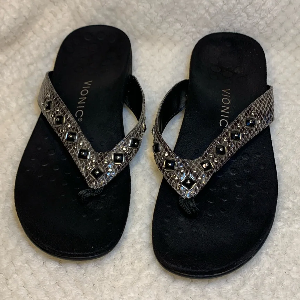 Vionic Dawn womens flip flop sz 8 snake print slate black studded thong sandal Gray - $30 - From Emily