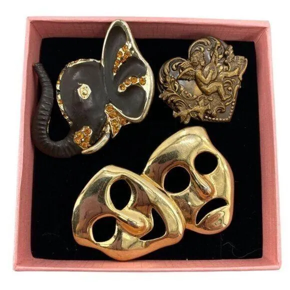Vintage Gold Tone Metal Brooch Lot Of 3. In good condition in a gift box and includes: -Vintage Gold Tone Drama Theatre Comedy Tragedy Masks Brooch Pin 2 1/4” long, 2” tall. -Vintage Cupid Heart Art Nouveau Brass Stamped Pin Brooch 1 1/4” long, 1 1/4” across. -Vintage Enamel Rhinestone Elegant Head Brooch 2” long, 1 1/2” tall.