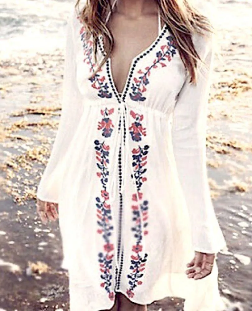 BOHO EMBROIDERED KAFTAN TUNIC DRESS Beach Swim Cover up OS (one size) - Measures as Women's Large EUC - Like new This beach dress is your new vacation essential. Featuring a lightweight fabric with sophisticated embroidery and a drawstring waist, we're obsessed. Pair it with strappy sandals for a bohochic look. Cover-up Type: Dress Dept: Women Sleeve Length: Long Material: Polyester Color: White Measurements: 35” LENGTH 16.5” SHOULDER 21” P2P 18.5” WAIST 23” HIP bohemian #boho #bohemianstyle #hippie #bohofashion #bohostyle #lagenlook #earthy #indie #vacay #embroidered #retro #70s #minimalist #summer #tropical #island #resortwear #beachy #goddess #vacation #sophisticated #feminine #lightweight #soft