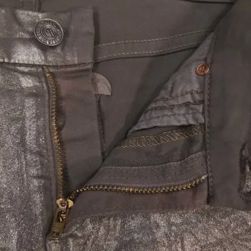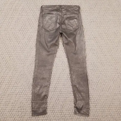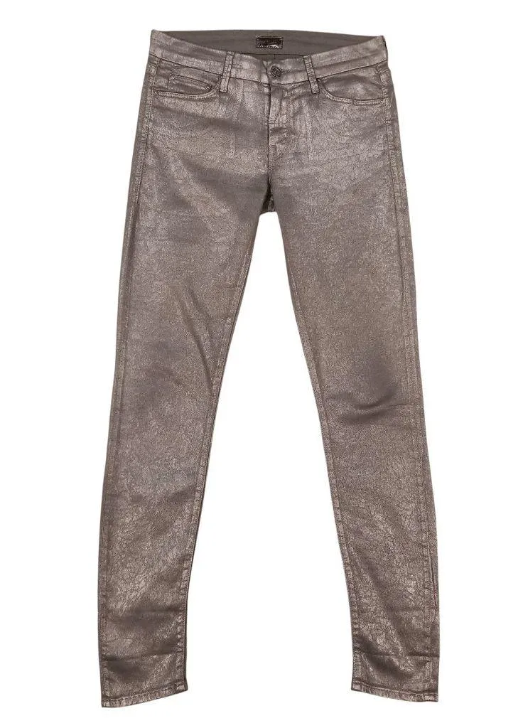Mother "The Looker" jeans in "Disturbing the Peace Gunmetal". Size 26. These stretch jeans feature a shiny metallic gunmetal colored coating with a crackled finish, classic 5-pocket styling, skinny fit, zipper fly with button closure, and belt loops. Fabric: 98% cotton, 2% lycra. Gently preloved - red discoloration to uncoated cotton fabric around zipper - not visible when worn. Small loss of metallic coating at crotch from rubbing/friction - see close-up photo. Approx measurements: Waist: 14.25” Rise: 8.25” Inseam: 29.5” Offers welcome