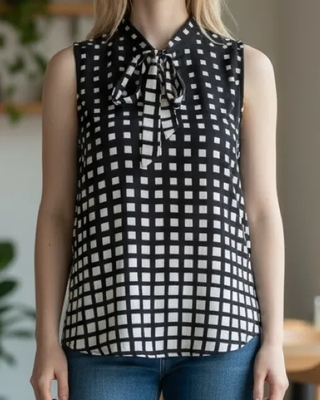 Elegant blouse with a geometric pattern. Features a stylish bow tie detail. 2 side zippers Excelle... Show more