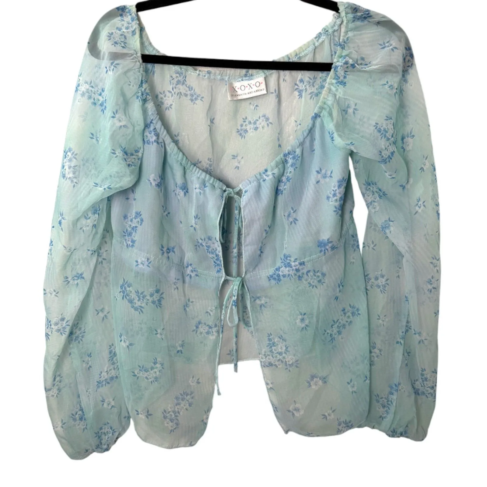 XOXO Vintage 90s Sheer Blue Mesh Floral Long Sleeve Tie Front Babydoll Blouse Size Medium Size: Med... Show more