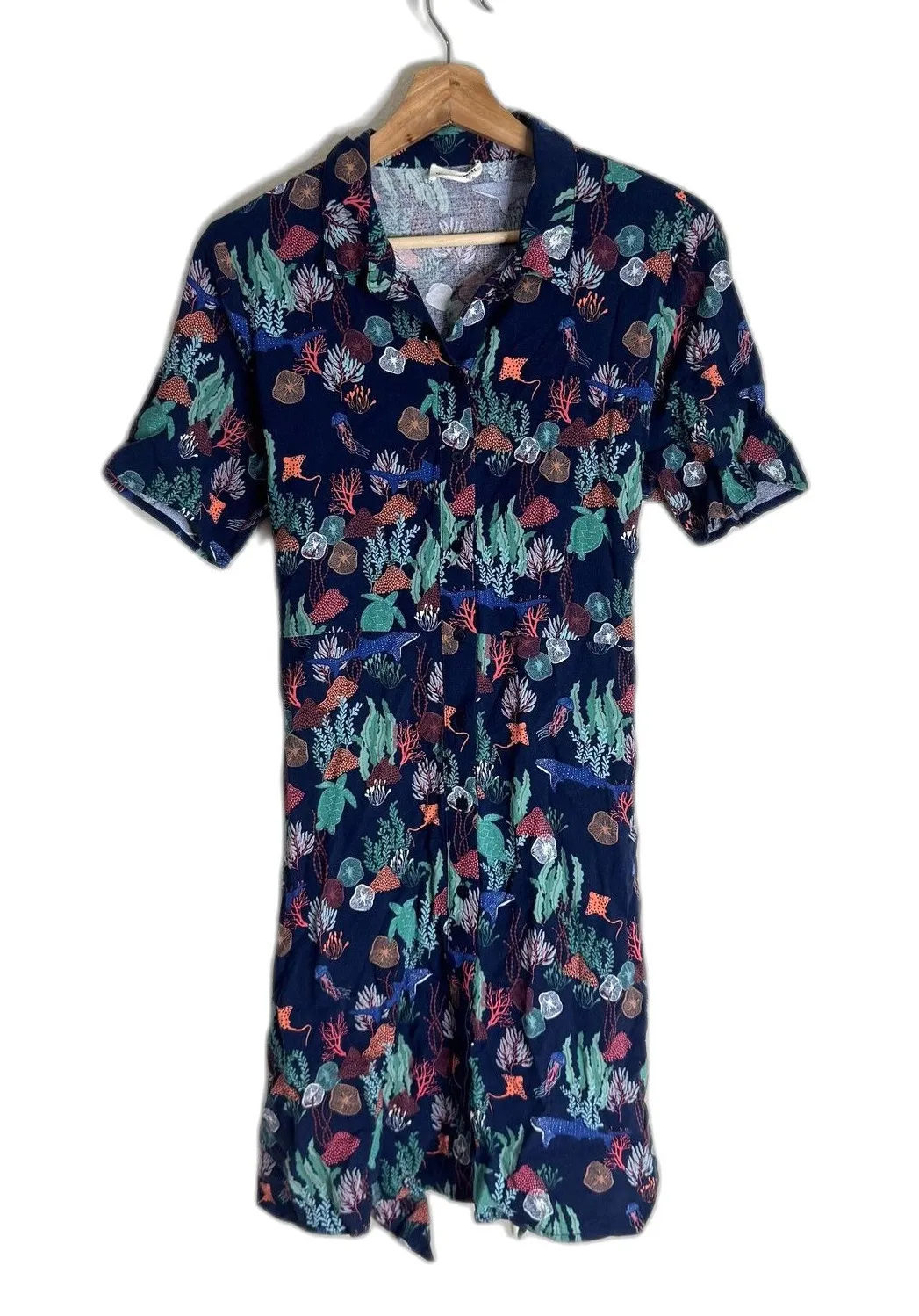 Brand: Sugarhill Brighton Item: Women's short sleeve shirt dress Tag size: UK 14 / EU 42 / US 10 Color/Pattern: Navy blue with multicolor underwater sea life print (sea turtles, jellyfish, stingrays, coral, seaweed, starfish) Material: 100% Viscose (FSC approved) Features: Collared neckline, button-front closure, short sleeves, self-tie waist belt, belt loops Style: Casual shirt dress with playful ocean-themed print Care info on tag: Delicate machine wash at 30°C; wash inside out; air dry; stretch back into shape and iron while damp; do not tumble dry; do not bleach Country of origin: Made in China Notes: Pattern placement may vary slightly from photos bag90 420 boho , cute , festival , dreamy , modest , teacher