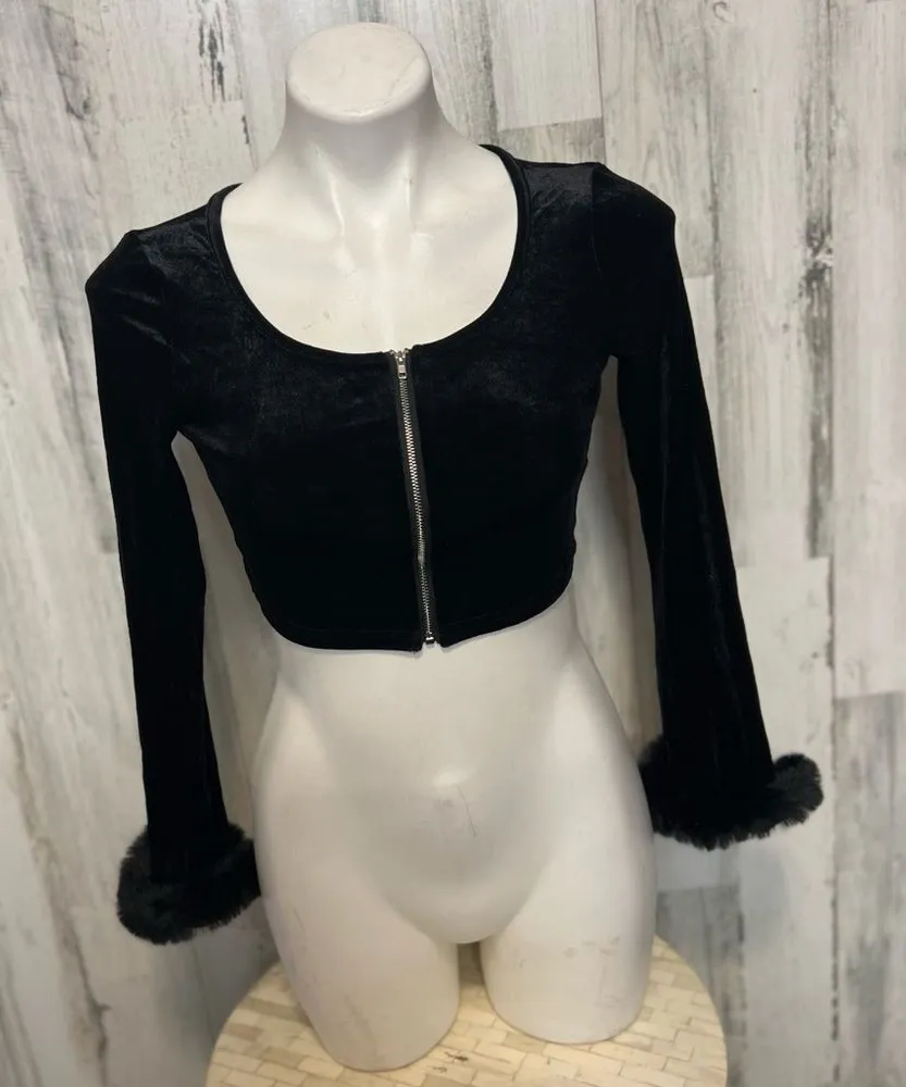 Size: XS Measurements (approx using AI): • Pit to pit (chest): ~14” • Length (shoulder to hem): ~13” • Sleeve length: ~24” Smoke-free home No rips No stains Ships fast — same or next day Open to offers or bundles! Measurements are estimated using AI based on mannequin fit. Please allow slight variation. Fabric: Velvet polyester blend with faux fur cuffs