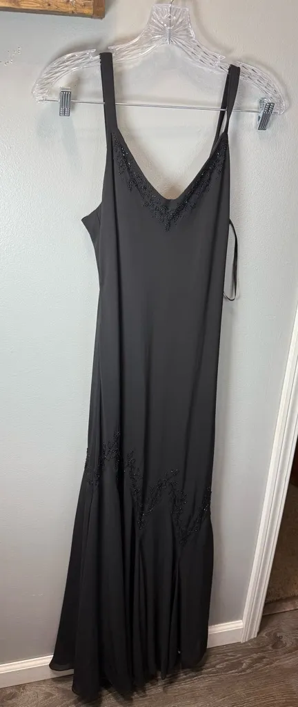 Xscape Petite Black Beaded Maxi Dress Size 8P Formal Cocktail Party This timeless black evening gown exudes understated elegance. It features delicate beaded detailing along the neckline and lower hem, adding a touch of sparkle to the classic silhouette. The dress has wide shoulder straps, a soft v-neckline, and a flowy floor-length skirt that drapes beautifully. Perfect for formal occasions, galas, weddings, or black-tie events. 16" ptp fairy, grunge, whimsey, goth, vintage-inspired, timeless, classic, classy, quiet luxury, elegant, beaded, gorgeous 943